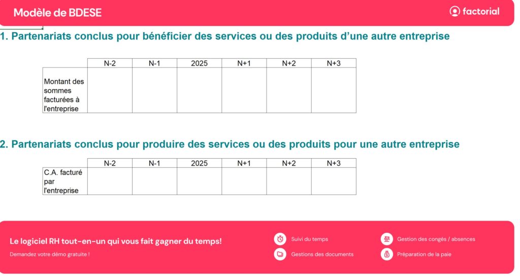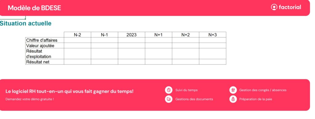 Le deuxième modèle excel de BDESE présenté ici est celui du célèbre site Factorial (trouvable sur https://factorial.fr/modeles/modele-bdese ).