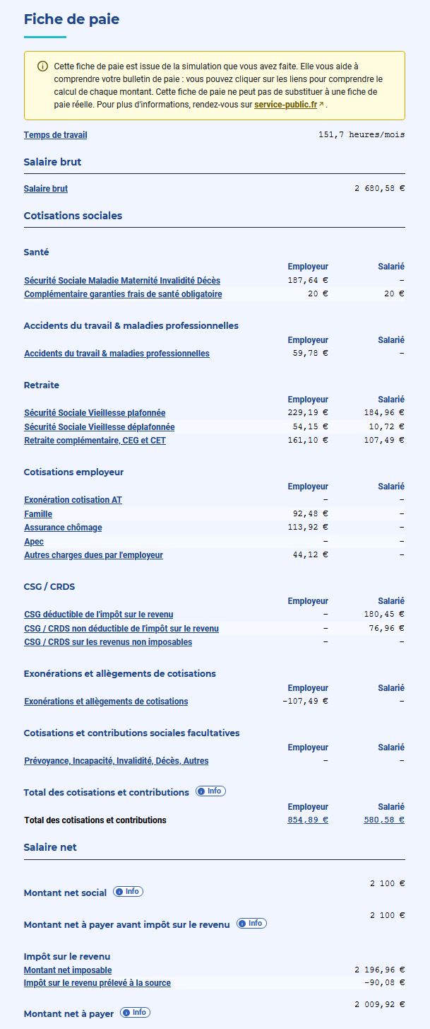 Voici un exemple de décompte de fiche de paie fourni dans ce cas par l’outil gouvernemental https://www.urssaf.fr/accueil/outils-documentation/simulateurs/cotisations-employeur.html