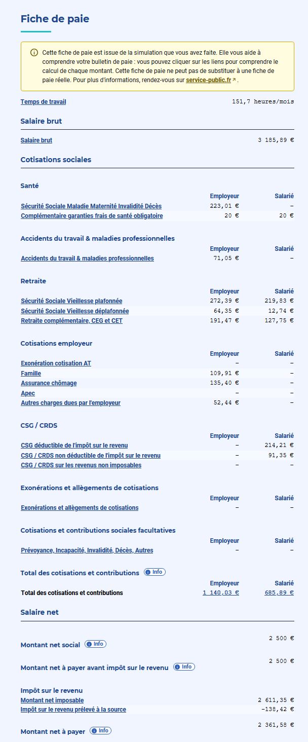 Voici un exemple de décompte de fiche de paie fourni dans ce cas par l’outil gouvernemental https://www.urssaf.fr/accueil/outils-documentation/simulateurs/cotisations-employeur.html
