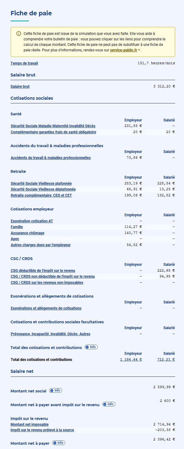 Voici un exemple de décompte de fiche de paie fourni dans ce cas par l’outil gouvernemental https://www.urssaf.fr/accueil/outils-documentation/simulateurs/cotisations-employeur.html