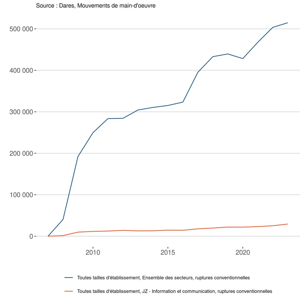 Voici le nombre des ruptures conventionnelles dans le secteur de la communication et de l’information (ligne rouge, l’autre ligne est « tous secteurs confondus »).