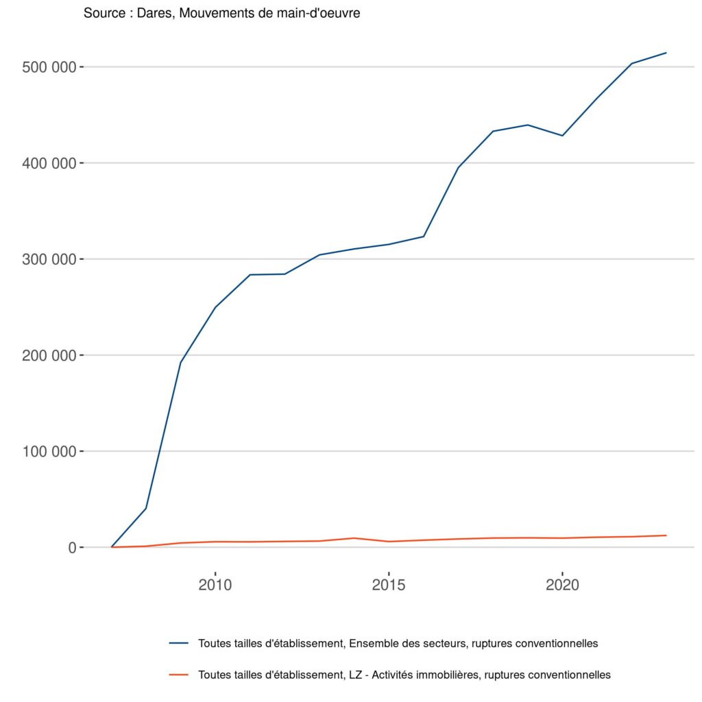 Dans le domaine des activités immobilières, le nombre de ruptures conventionnelles est étonnamment faible et sans évolution notable comme le montre ce graphique (source: Dares) (La ligne rouge concerne les activités immobilières tandis que l’autre ligne est « tous secteurs confondus »).