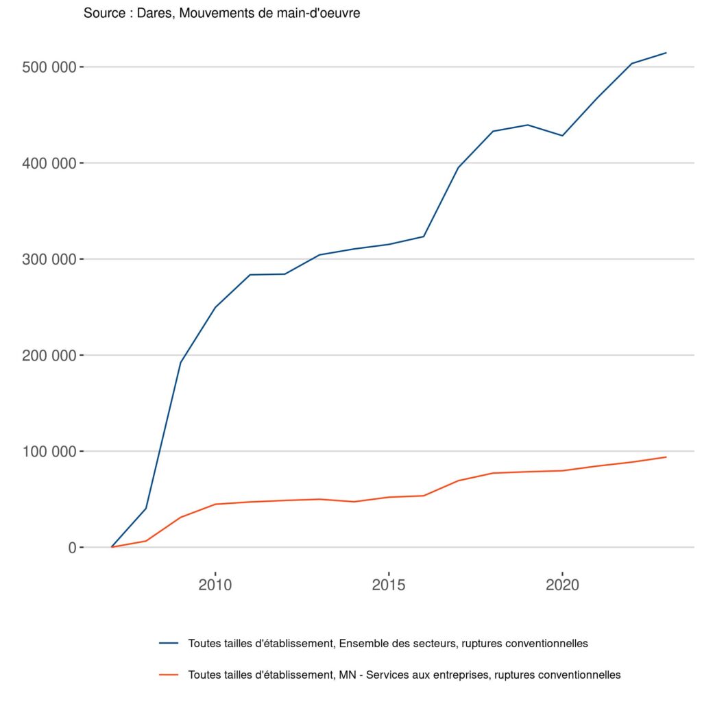 Voici le nombre des ruptures conventionnelles dans le secteur des services aux entreprises (ligne rouge, l’autre ligne est « tous secteurs confondus »).